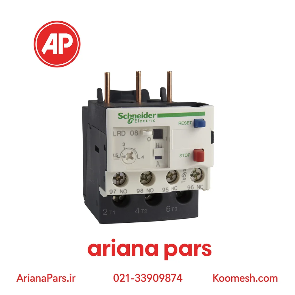 رله حرارتی TeSys LRD اضافه بار 0.25 آمپر690 ولت AC/DC است که در محدوده تنظیم جریان حرارتی 0.16-0.25 آمپر با کلاس تریپ 10 برای حفاظت از موتورهای 3 فاز 0.06 کیلووات 400 ولت استفاده می شود. بی متال اشنایدر مجهز به سیستم تشخیص قطع فاز است. در این تجهیز می توان با یک ولوم قابل تنظیم رنج جریان را انتخاب کرد که هم با حالت دستی و هم اتوماتیک قابل تنظیم است. هم چنین بی متال اشنایدر به یک دکمه ی تریپ مجهز شده که با آن می توان عملکرد صحیح دستگاه را تست کرد. به علاوه در این تجهیز کلیدهای ریسِت و استوپ، نشانگر وضعیت بی متال و 2 کنتاکت کمکی 1NO+1NC برای مشخص کردن خطا تعبیه شده است. دکمه ها و پیچ های تنظیمی با محفظه ی شفاف شیشه ای محافظت می شود. بیمتال اشنایدر توسط ترمینال­ های پیچی مستقیماً به ترمینال های پایین کنتاکتورهای 3 پل LC1D09-D38 متصل می شود.  رله بیمتال LRD را می توانیم با ترمینال پیچی یا ریل DIN روی تابلو نصب کنیم. در این صورت کنتاکتور از بی متال با استفاده از ترمینال بلاک LAD7B106  جدا می شود. بی متال اشنایدر در دمای 20 – تا 60 درجه سانتی گراد به خوبی کار می کند و درجه حفاظت آن IP20 است.